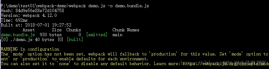 10.到这一步了,打包demo.js(不是默认的文件的时候), 黄色警告还是出现!那么应该怎么解决呢?那就是webpack的版本问题,命令不同了