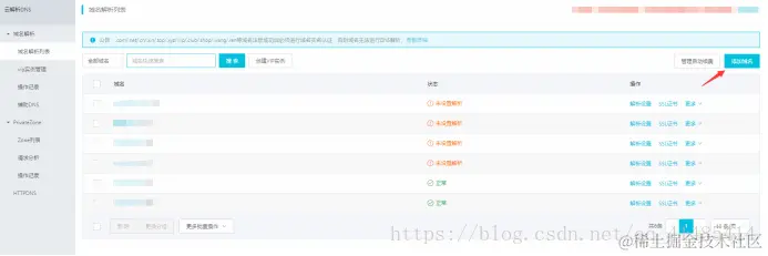 管理中心-我的菜单-管理平台-域名管理-我的域名中查询需要解析的域名