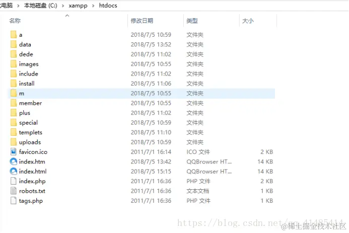 然后我们打开您的安装xampp的路径下,如果您没有改变安装路径的话,应该是在C盘的xampp,那么我们打开下面的htdocs,我前面说过这个文件夹,记性不好的可以翻上去看看,打开以后将里面的所有内容全部删除,是的就是清空,然后将刚才copy的粘贴到这里,这样的: