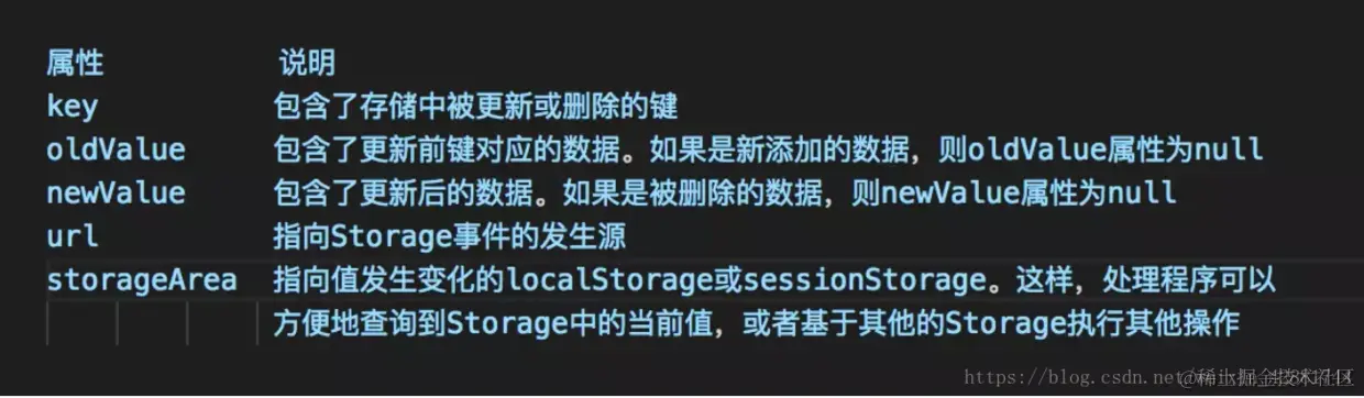 StorageEvent对象在事件触发时,会传递给事件处理程序,它包含了存储变化有关的所有必要的信息。