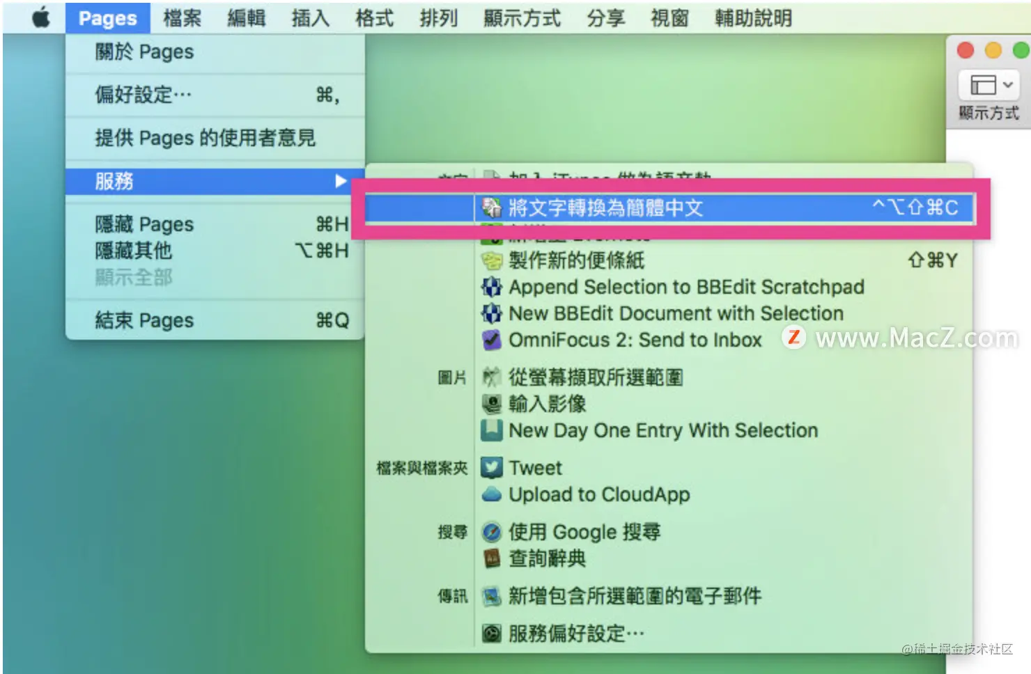 以pages为例,要使用时,只要先把要转换的文字选取,然后在选单中找到「服务」,就能在「服务」子选单中看到相关选项啰:
