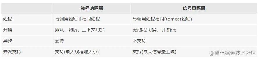 Hystrix提供两种资源隔离策略,线程池和信号量。它们之间的异同点如下: