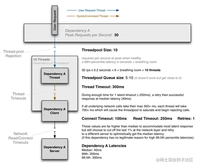 例如某服务TP99情况下每秒钟会接收30个请求,然后每个请求的响应时长是200ms,按如上公式计算可得:线程池大小 = 0.2 * 30 + 4(冗余缓冲值)= 10,超时时间 = 300ms