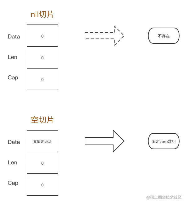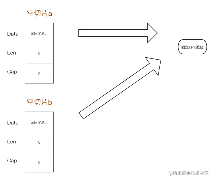 - 空切片的引用数组指针地址是有的,且固定为一个值
