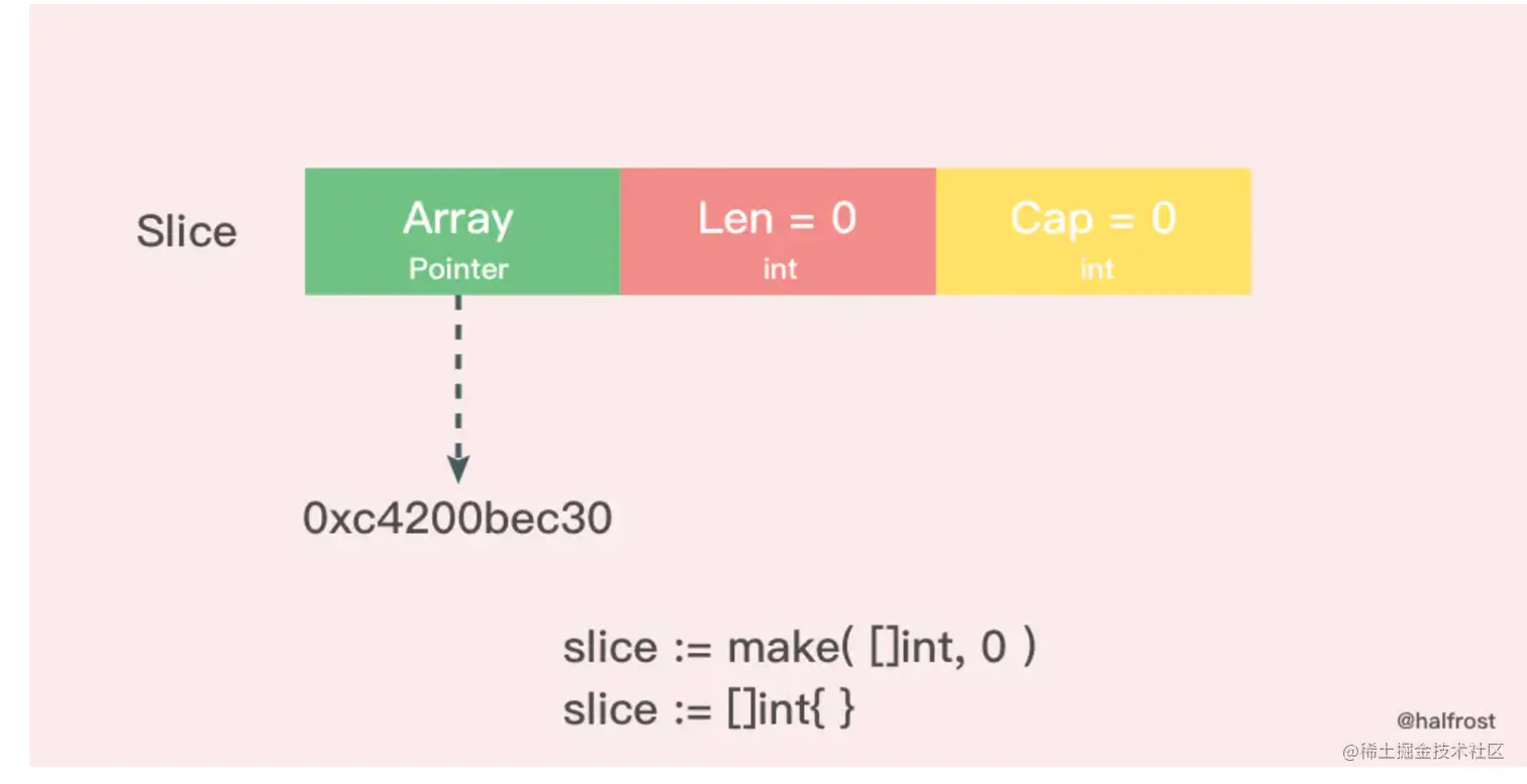 直接看代码,不同声明方式:使用 make() 函数生成的切片一定发生了内存分配操作,但给定开始与结束位置(包括切片复位)的切片只是将新的切片结构指向已经分配好的内存区域,设定开始与结束位置,不会发生内存分配操作。这里的内存分配我理解的就是引用数组指针地址