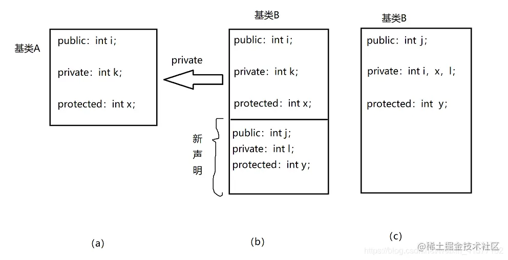 上述图片中(a)为基类(父类),(b)为派生类(子类),(c)是整理过后的派生类。可以看出通过私有继承图(c)中已经没有了类A的private变量k。这是因为通过私有继承,对父类的私有变量已经进行了封装,无法在派生类中访问(不可见)。同时,类A中的public与protected类型均转变为类B的private类型。