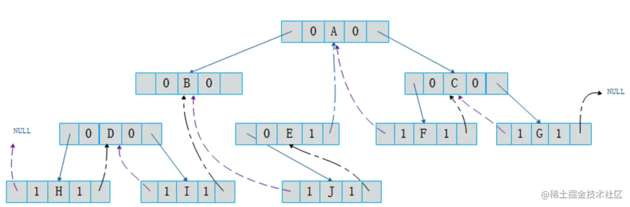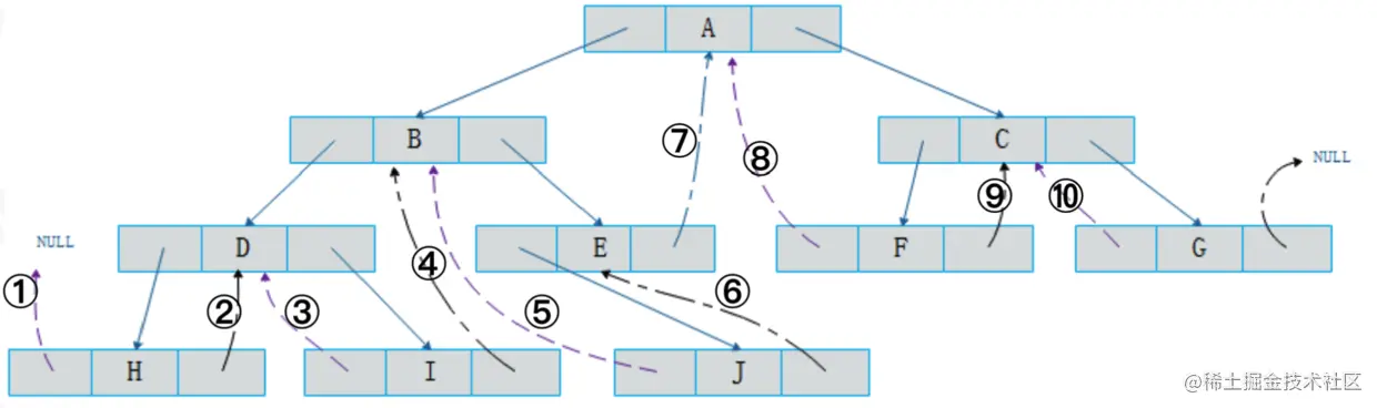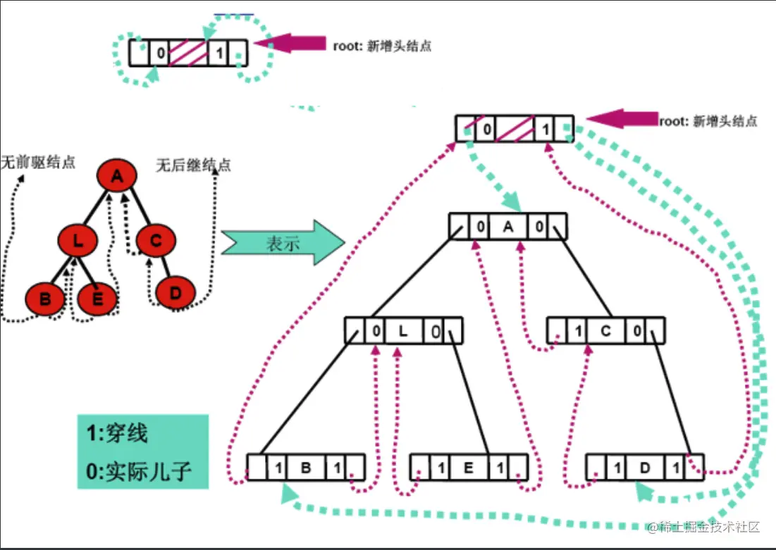 我们对二叉树进行中序遍历(不了解二叉树遍历请参考二叉树介绍), 将所有的节点右子节点为空的指针域指向它的后继节点 所有节点左指针域为空的指针域指向它的前驱节点
