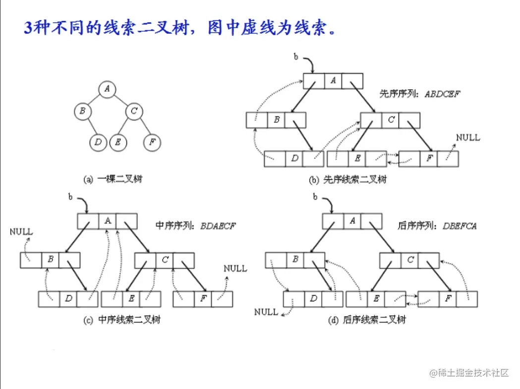 这种加上了线索的二叉链表称为线索链表,相应的二叉树称为线索二叉树(Threaded BinaryTree)。根据线索性质的不同,线索二叉树可分为前序线索二叉树、中序线索二叉树和后序线索二叉树三种。