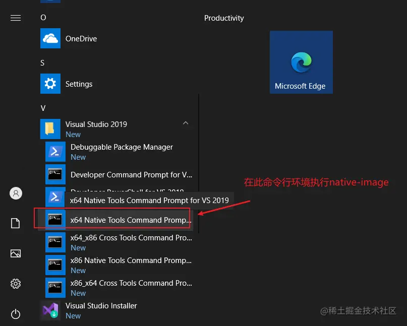 点击左下角的开始菜单,点击x64 Native Tools Command Prompt进入命令行环境