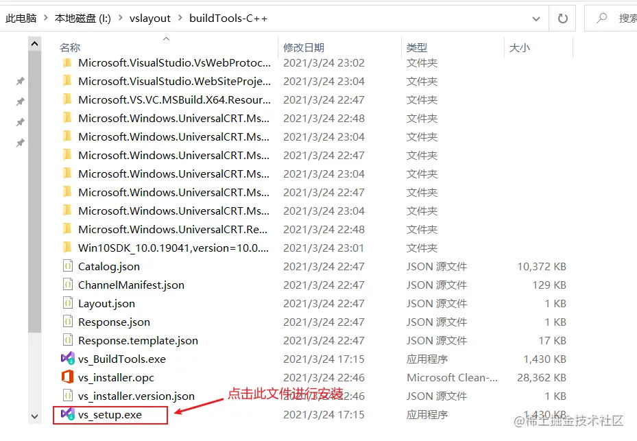 下载完毕后,进入buildTools-C++目录,点击vs_setup.exe文件进行安装