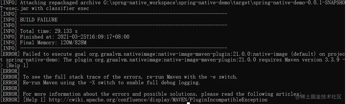 Failed to execute goal org.graalvm.nativeimage:native-image-maven-plugin:21.0.0:native-image (default) on project spring-native-demo: The plugin org.graalvm.nativeimage:native-image-maven-plugin:21.0.0 requires Maven version 3.3.9