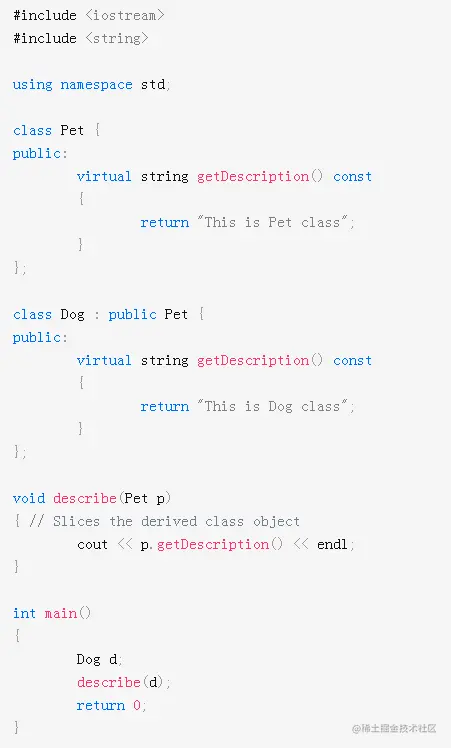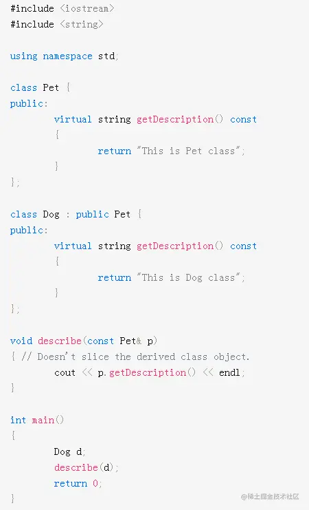 3)避免对象切片: 如果我们将子类的对象传递给需要超类对象的函数,则如果按值传递,则对传递的对象进行切片。例如,考虑以下程序,它打印“ This is Pet Class”。