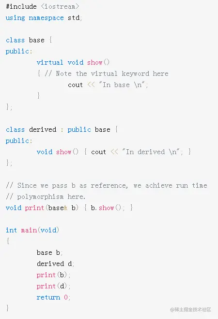 例如,在以下程序中,print()接收对基类对象的引用。如果传递了基类对象,则print()调用基类函数show();如果传递了派生类对象,则调用派生类函数show()。