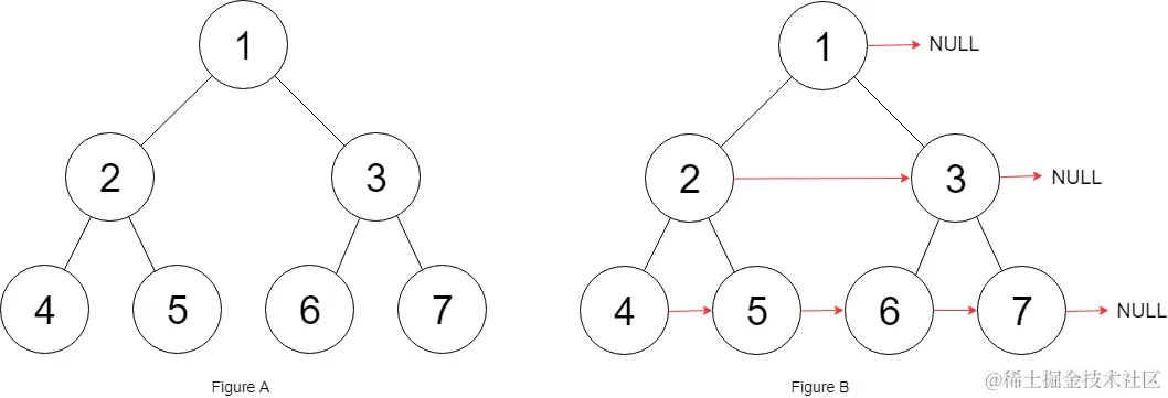输入:root = [1,2,3,4,5,6,7] 输出:[1,#,2,3,#,4,5,6,7,#] 解释:给定二叉树如图 A 所示,你的函数应该填充它的每个 next 指针,以指向其下一个右侧节点,如图 B 所示。序列化的输出按层序遍历排列,同一层节点由 next 指针连接,'#' 标志着每一层的结束。