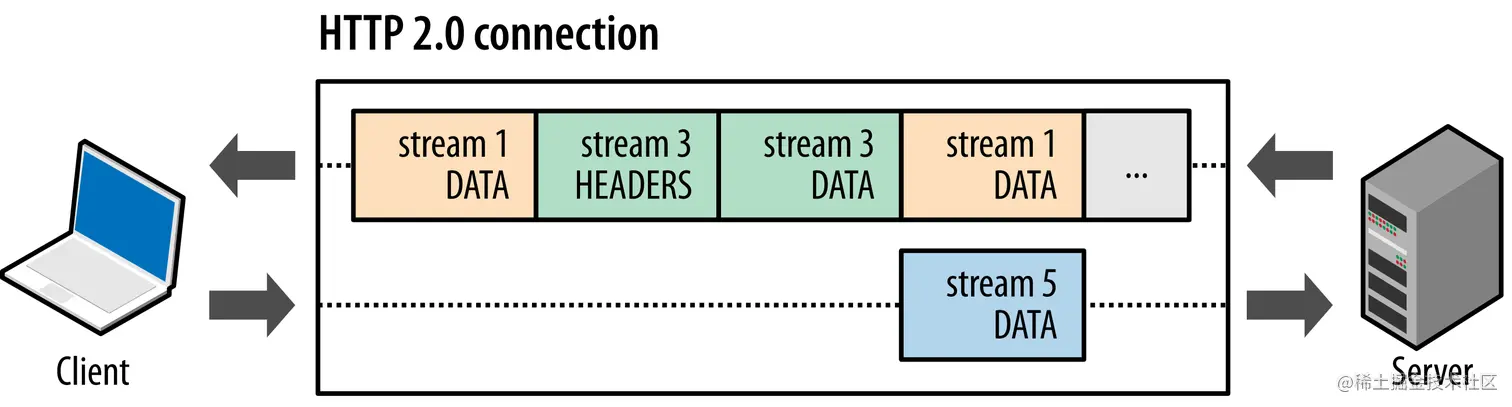 上图中包含了一个连接上多个传输中的 Stream:Client 正在向服务端发送 Stream5 的 Data Frame,同时 Server 也在向 Client 交错发送 Stream1 和 Stream3 的 Frame,在这条 TCP 连接上有 3 个请求 / 响应的数据进行交互