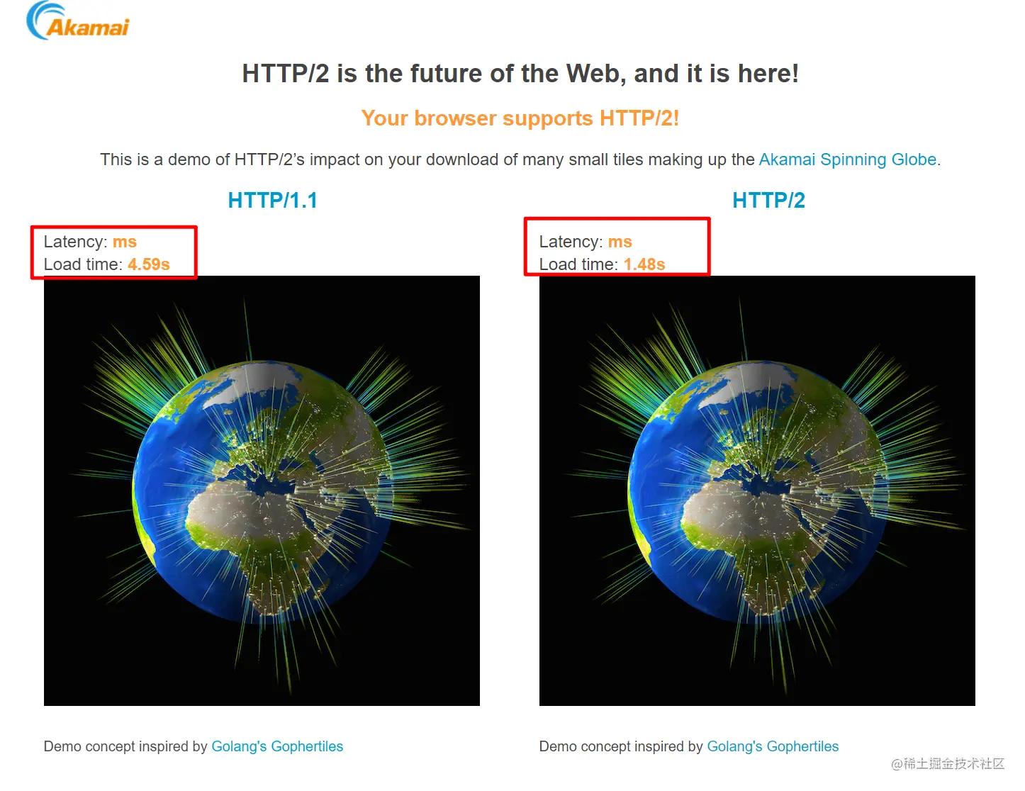 这个网站,提供了一个 HTTP/2 和 HTTP/1 在同时加载多个资源时的速度差异:http2.akamai.com/demo,这个网页中同时下载 400 个小图片,可以看到 HTTP2 的加载速度远超 HTTP/1