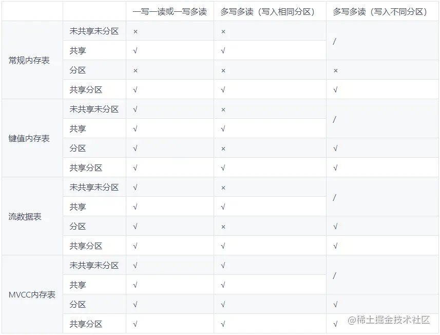 在没有写入的情况下,所有内存表都允许多个线程同时查询。在有写入的情况下,4种内存表的并发性有所差异。下表总结了4种内存表在共享/分区的情况下支持的并发读写情况。