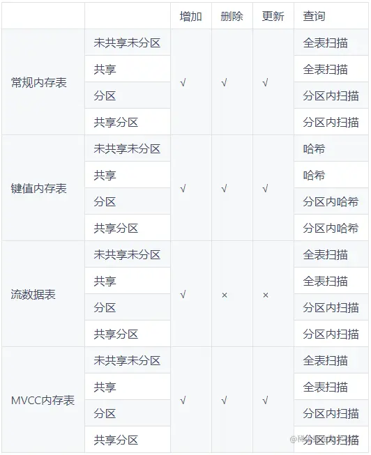 下表总结了4种类型内存表在共享/分区的情况下支持的增删改查操作。