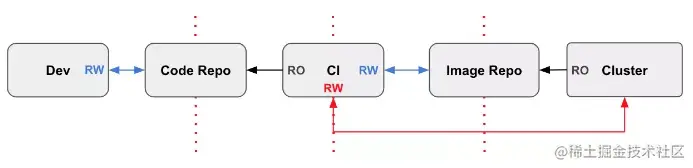 GitOps建议不直接将应用程序部署到线上环境中,而是将应用程序和相关配置打包成镜像,并存储到镜像库中,最后,通过镜像的方式生成容器,并部署到线上环境中。