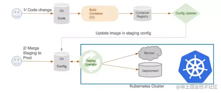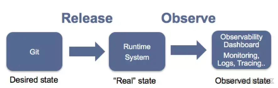 GitOps是面向发布的操作模型,请参见下图。交付速度取决于团队在此周期中绕过各个阶段的速度。