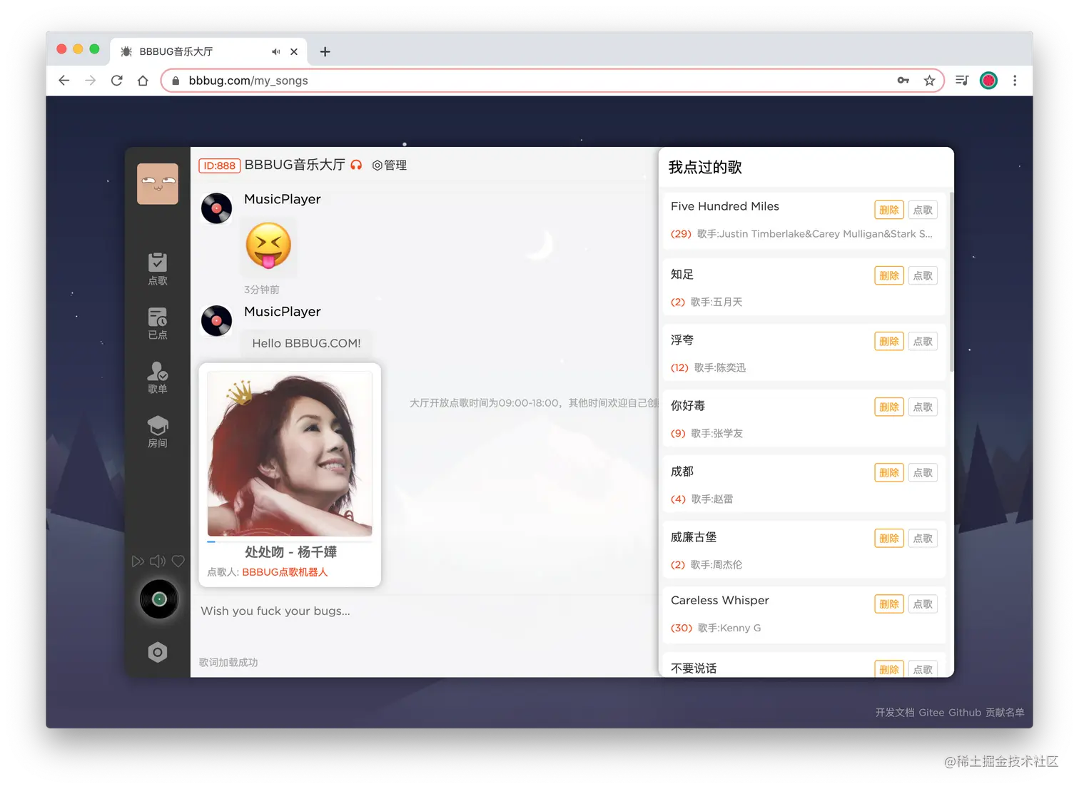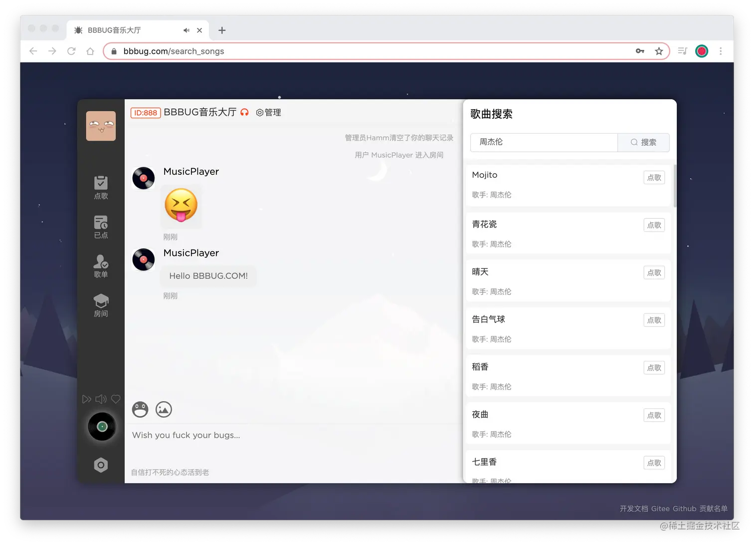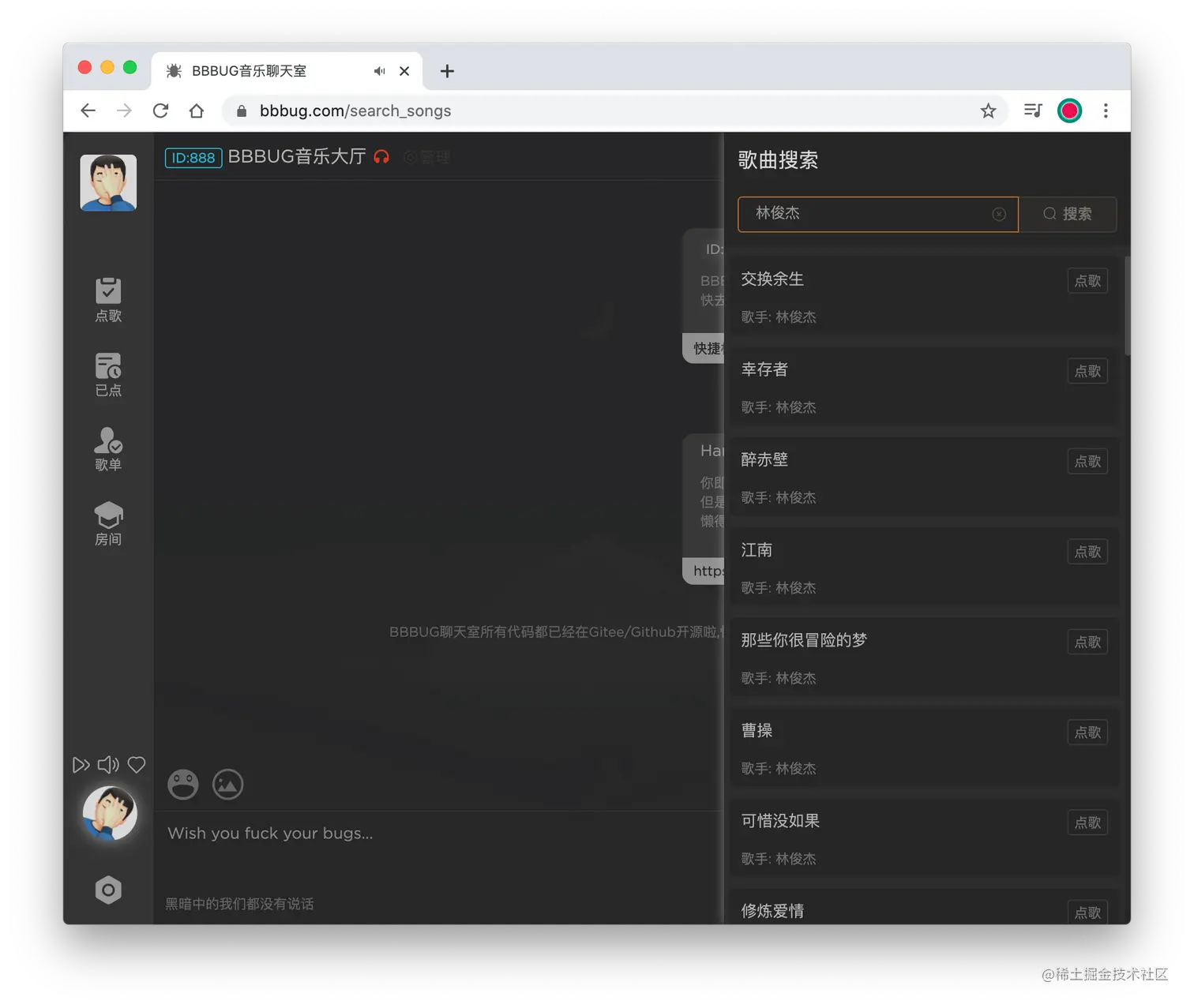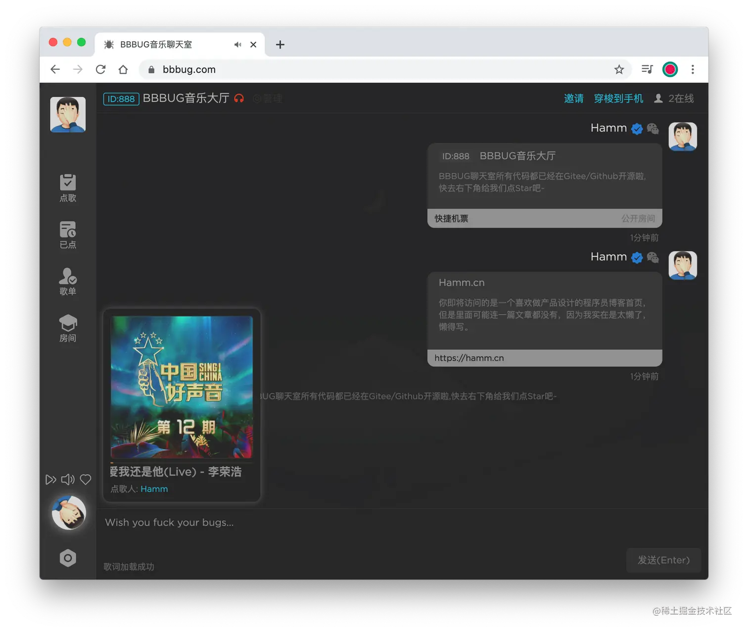 BBBUG一个在线听歌的聊天室,支持多房间和创建私人房间,支持房间加密和切换房间模式,体验一下:www.bbbug.com