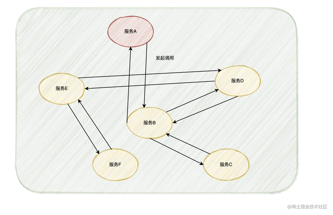 服务A->服务B->服务C->服务D->服务E->服务F