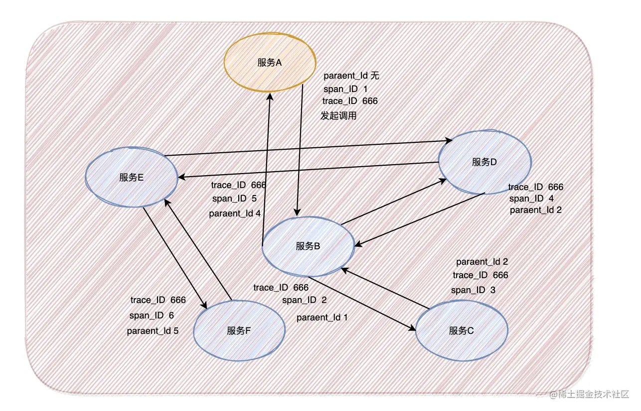 没错,就是再引入一个span_ID来判断服务的先后调用顺序,如图,就可以判定调用链路为