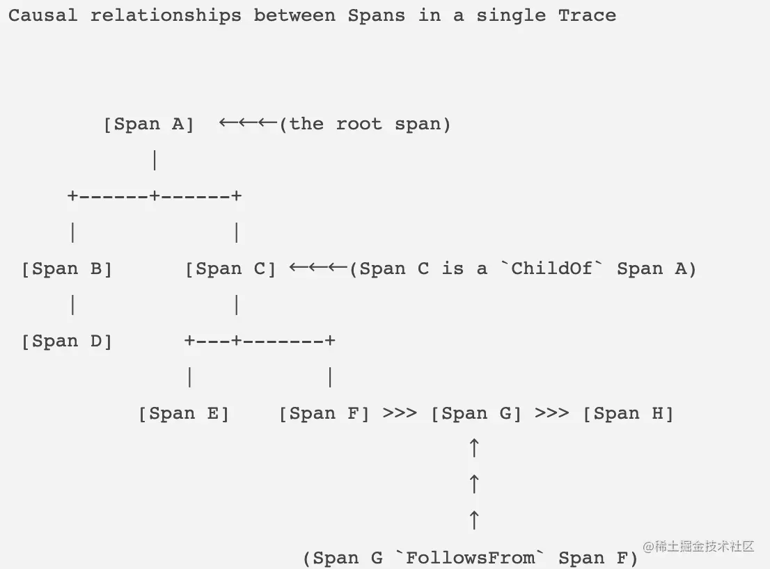 - FollowsFrom:其实也是父子关系,子Span是由父Span调用产生的,但父Span是否完成不依赖于子Span,在这种场景下,子操作仅仅由父操作触发。符合这种关系的操作可以进一步分成很多子类型,。