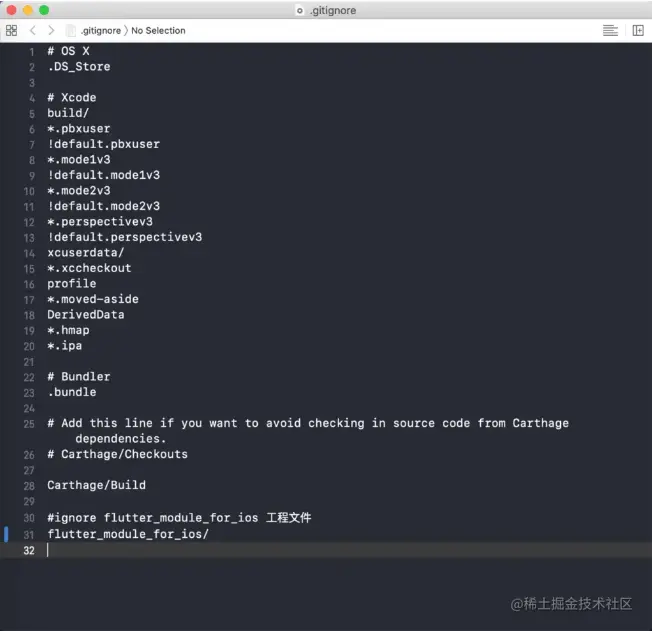 为了防止上传文件过大的限制,可以选择在.gitignore文件中选择不上传flutter_module_for_ios代码,只将ios_frameworks文件中的库文件上传就好