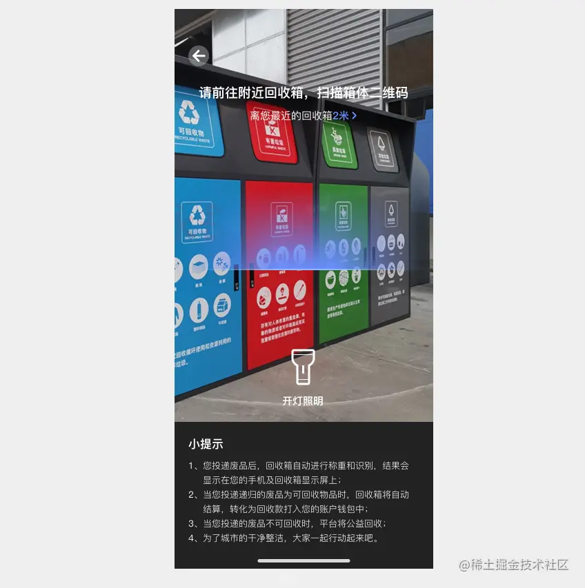 1)在首页顶部,点击扫码投递,则可打开扫码界面,扫描回收箱上的二维码,进行垃圾投递;