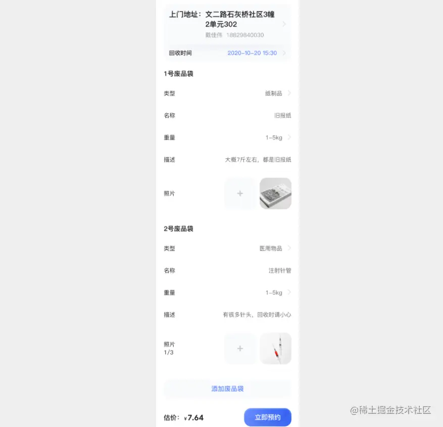 1)点击首页上门回收,进入预约界面,填写地址及回收废品详细信息;