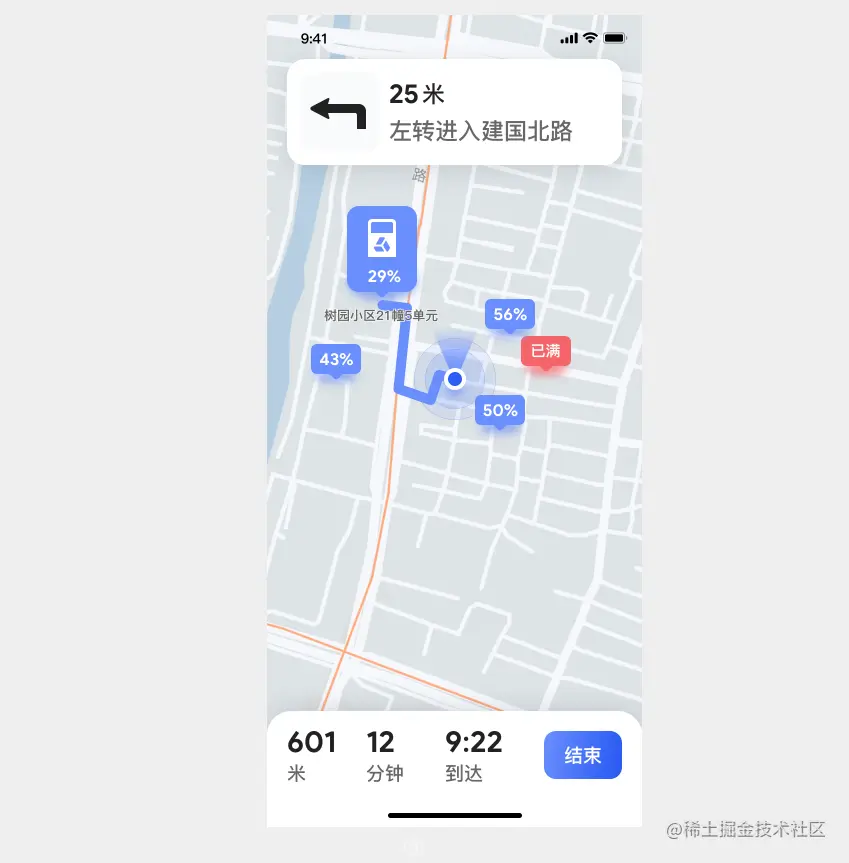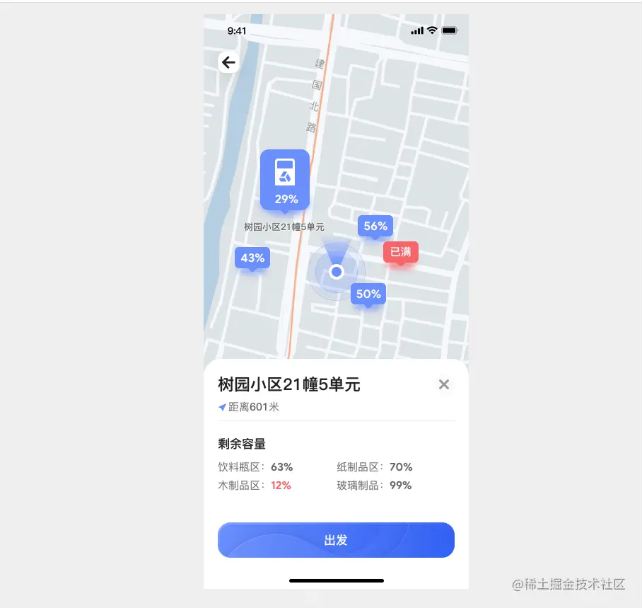 3)在首页,点击“附近的回收箱”,可进入导航功能,选择回收箱,出现导航路线;