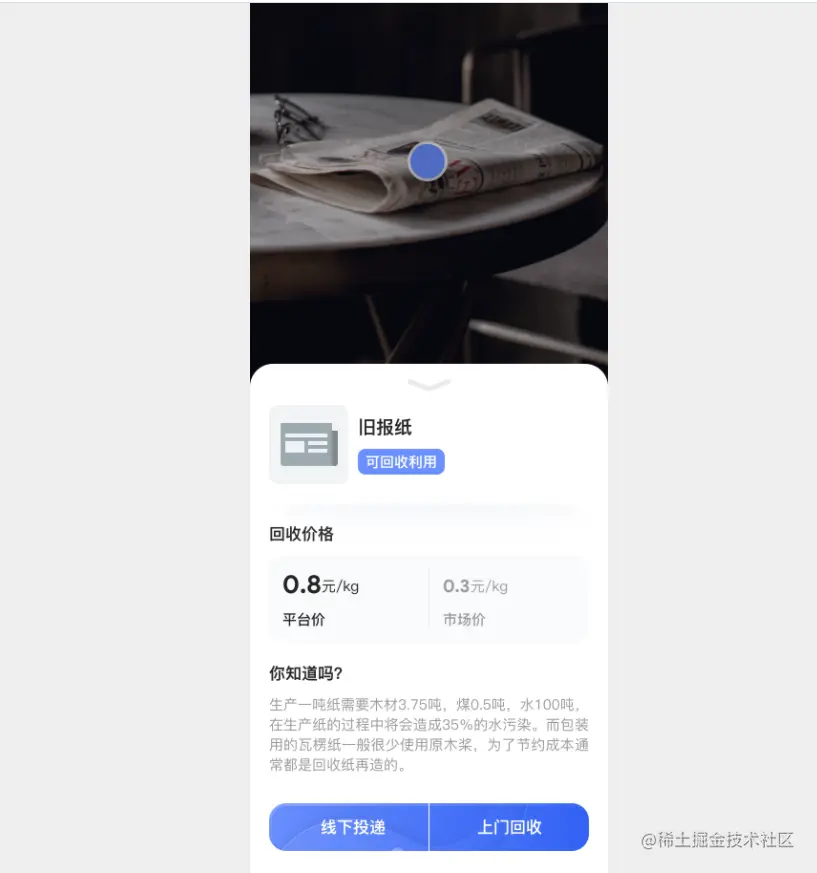 1)废品识别功能;在首页顶部,点击“废品识别”可打开手机摄像头,启用图像识别功能;