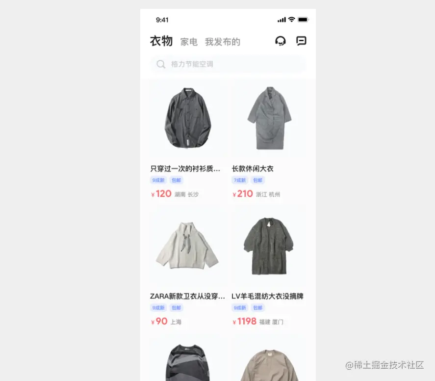 1)点击首页底部“旧物”,进入二手商品交易界面‘’,在这里用户可以买入/卖出二手物品,主要包含衣物及家电;