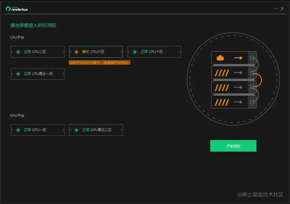 瑞云渲染客户端登录时,新增平台选择页面,可概览各个平台的空闲/繁忙情况,用户可根据自己的项目需要选择合适的平台提交作业。