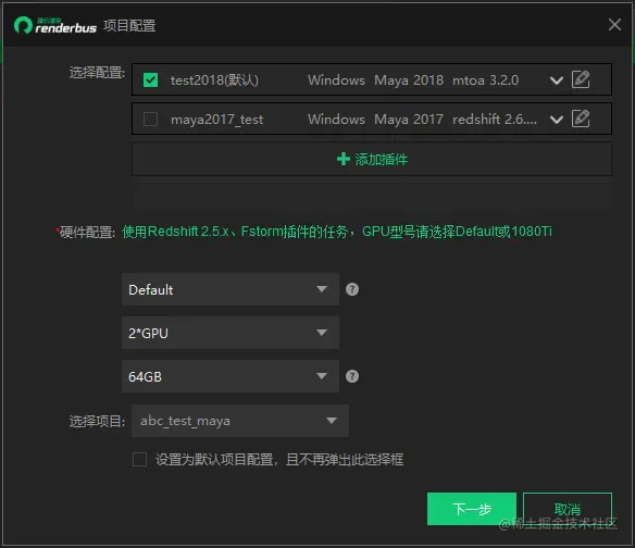 瑞云渲染影视动画CPU平台默认选择Default、64GB;GPU平台默认选择Default、2*GPU、64GB。