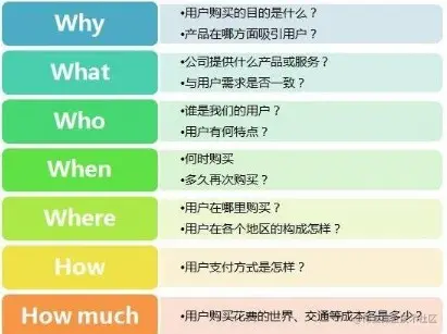 5W2H分析法又称七何分析法,包括:Why、What、Where、When、Who、How、How much 。主要用于用户行为分析、业务问题专题分析、营销活动等,是一个方便又实用的工具。