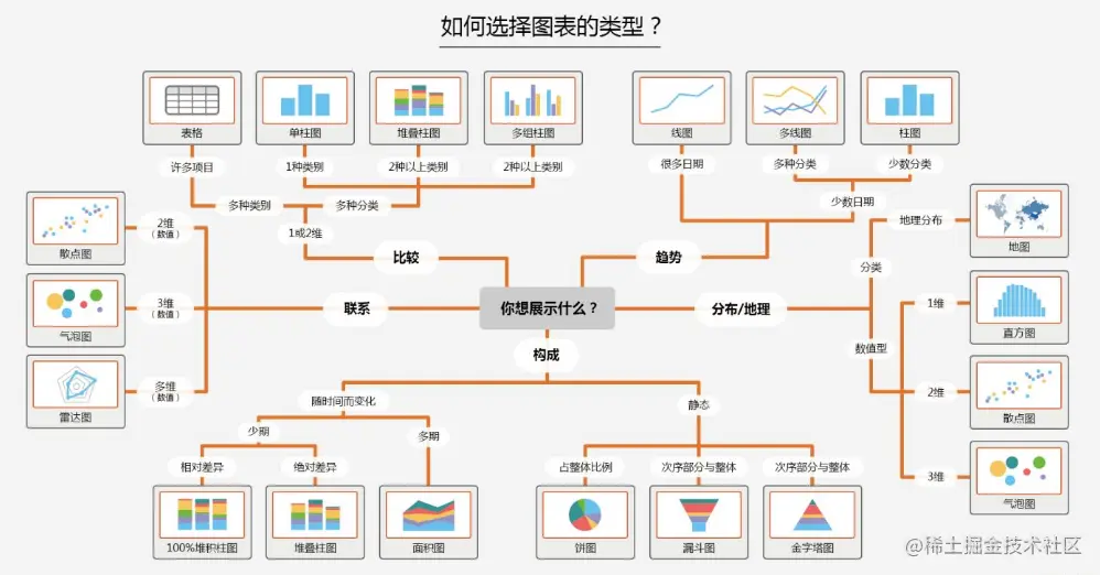 图表的选择,不只是关注图表的样式,而关键在于关注数据情况及图表展示的功能。可以通过数据展示的功能(构成、比较、趋势、分布及联系)进行图表选择,如下所示: