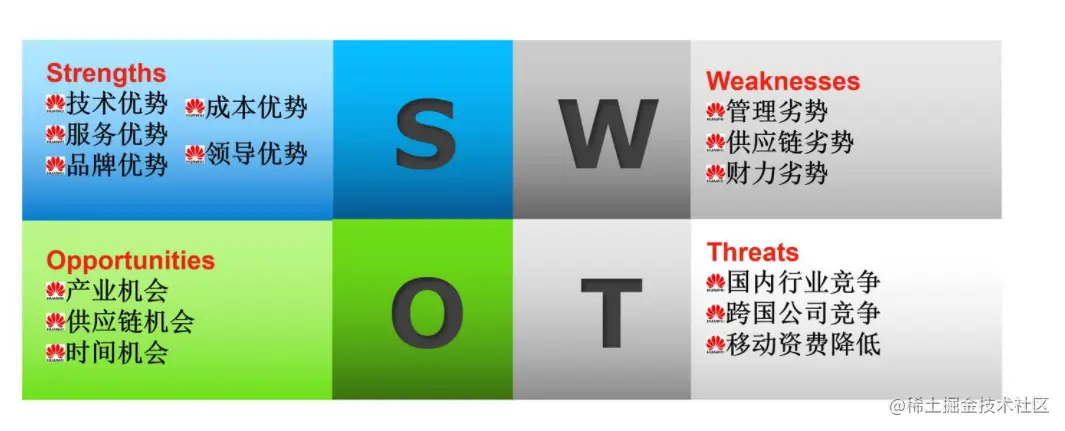 SWOT分析法也叫态势分析法,S (Strengths)是优势、W (Weaknesses)是劣势,O (Opportunities)是机会、T (Threats)是威胁或风险。常用来确定企业自身的内部优势、劣势和外部的机会和威胁等,从而将公司的战略与公司内部与外部环境有机地结合起来。以HUAWEI 的SWOT分析为例: