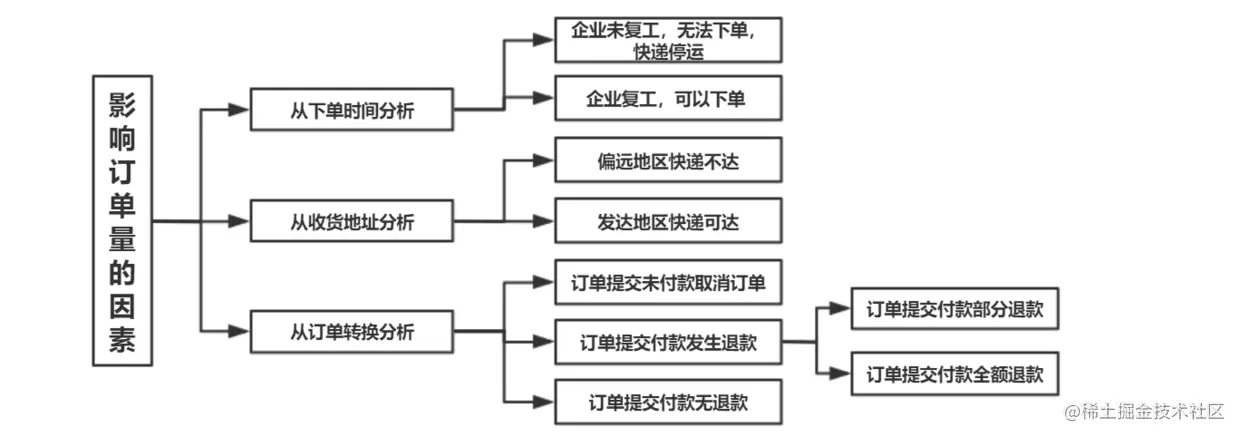 本文结合订单流程以逻辑树方法分析订单数目的影响因素,从以下几个维度展开: