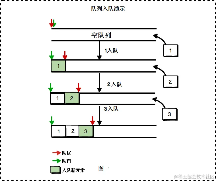 - enqueue 从队列尾部添加一个元素(新来一个排队的人,文明礼貌,站在了队伍末尾)
