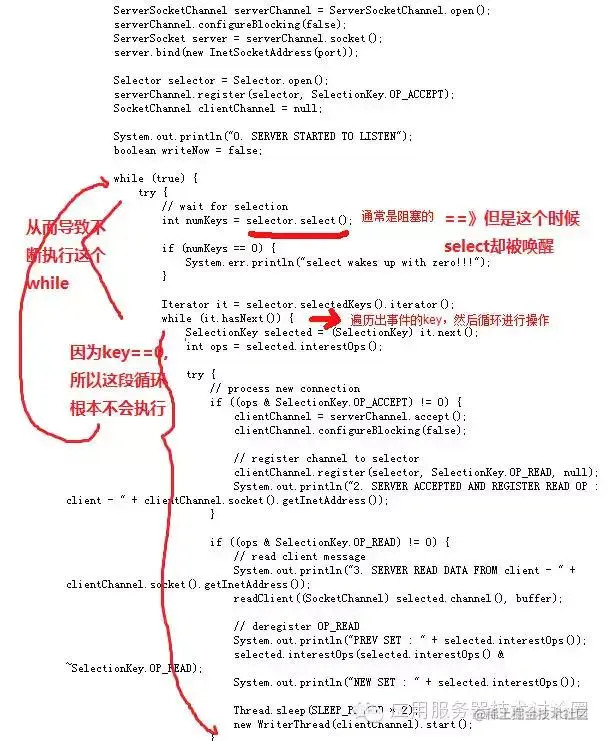 对于空轮询问题,图上已经标记得很清楚了,简单来说,就是关注的select轮询事件返回数量为0时,NIO照样不断的从select本应该阻塞的Selector.select()/Selector.select(timeout)中wake up出来,导致CPU 100%问题,