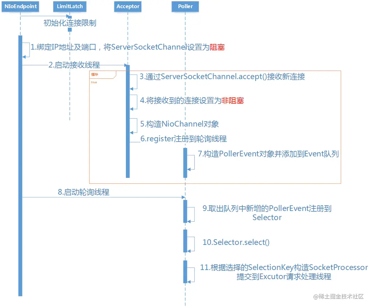 Acceptor,一个线程处理,用来接收服务端请求,然后丢给Poller处理; - 处理读事件的线程为