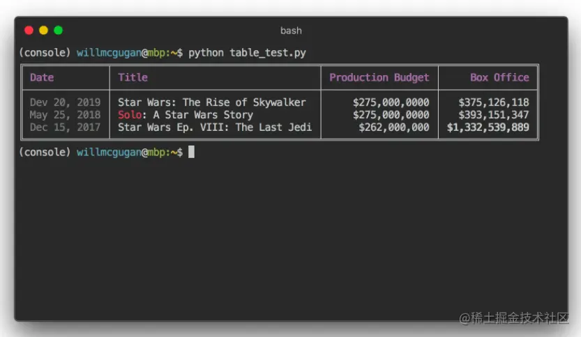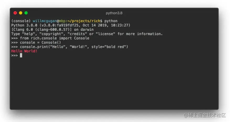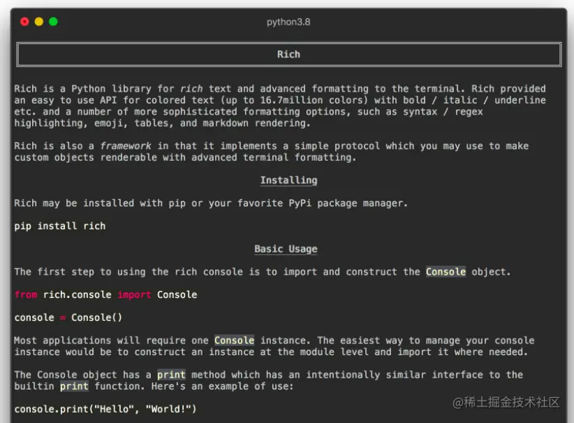 只需导入 rich 打印方法,就可以想毫不费力地把 Rich 的输出功能添加到应用程序中。该方法和其他 Python 的自带功能的参数类似。