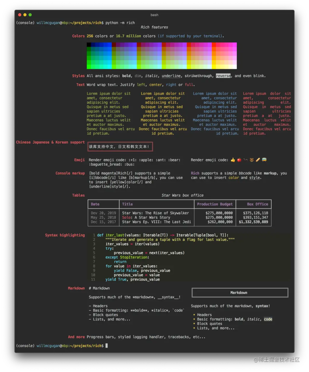 Rich 支持三大平台 Linux、OSX 和 Windows。真彩色/表情符号可与新的 Windows 终端一起使用,Windows 的经典终端仅限 8 种颜色。Rich 要求 Python 版本最低 v 3.6.1。可以与Jupyter 笔记本一起使用,而无需其他配置。