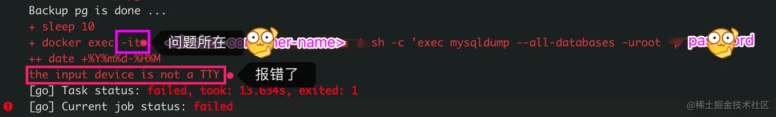 随即,查看了脚本发现报错地方是执行了一个 exec 的 docker 命令,大致如下所示。很奇怪的是,手动执行或直接调脚本的时候,怎么都是没有问题的,但是等到 CI 调用的时候怎么都是有问题。后来好好看下下面这个命令,注意到 -it 这个参数了。