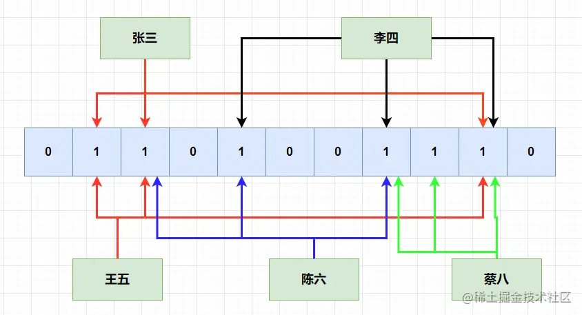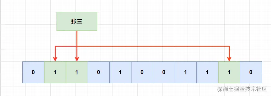 假设后面又来了一个张三,那么在hash的时候,同样会hash到以下位置,所有位都是1,我们就可以说张三已经存在在里面了。