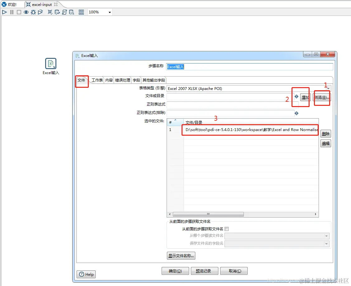 第二步:双击“Excel输入”节点,进行配置,在“文件”选项卡中:1,点击浏览按钮选择本地excel文件;2,点击增加将文件添加到3区域;