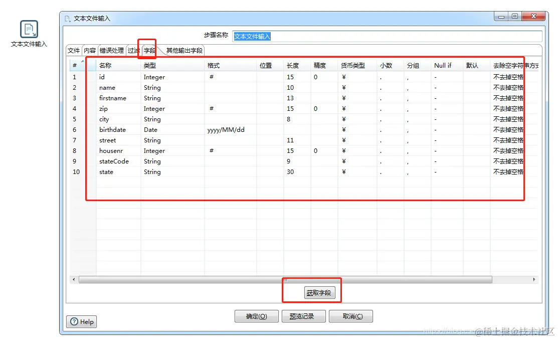 第四步:在“字段”选项卡中,点击“获取来自头部数据的字段”,如下图。(“内容”选项卡,“错误处理”选项卡,“其他输出字段”选项卡 不需要进行配置)