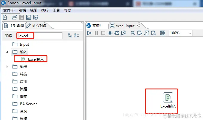 第一步:将“Excel输入”节点拖拽到工作区,如下图所示